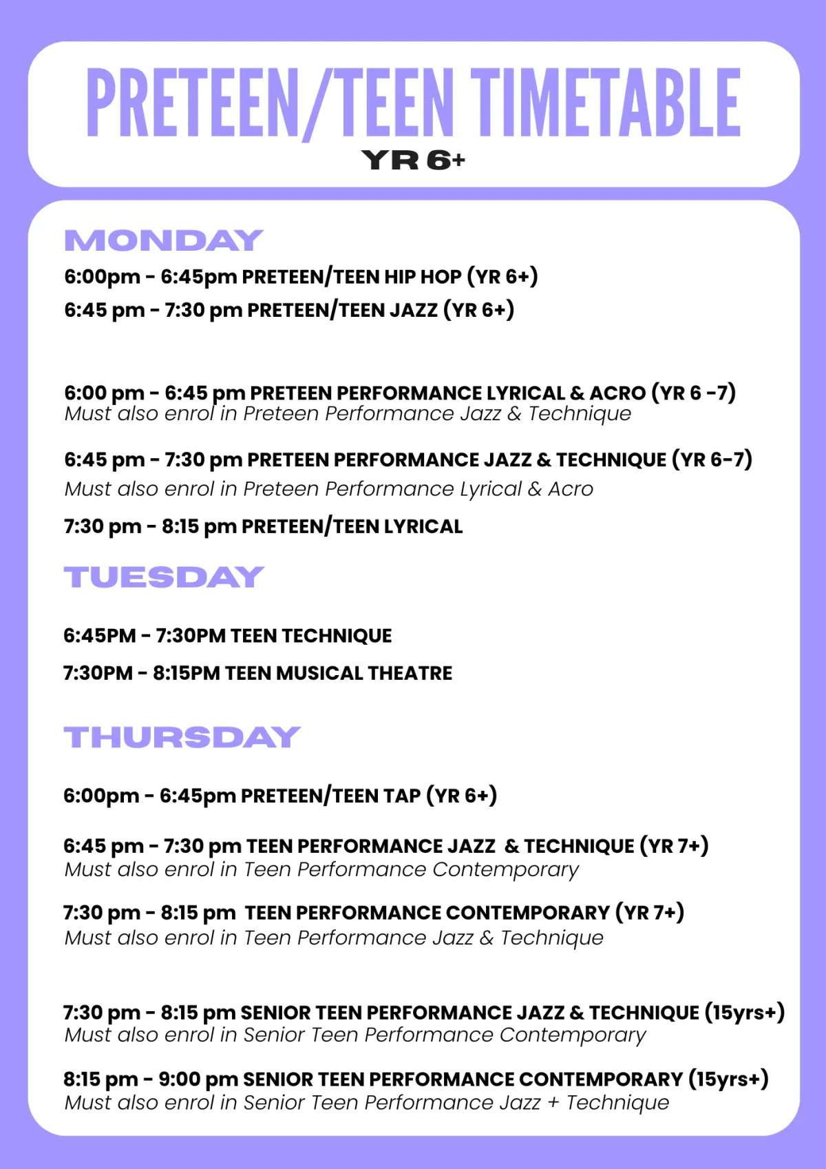 For this reason, it is required that students who wish to join the Performance program enrol in both classes of their age group to ensure well-rounded and equal dance training across the program.